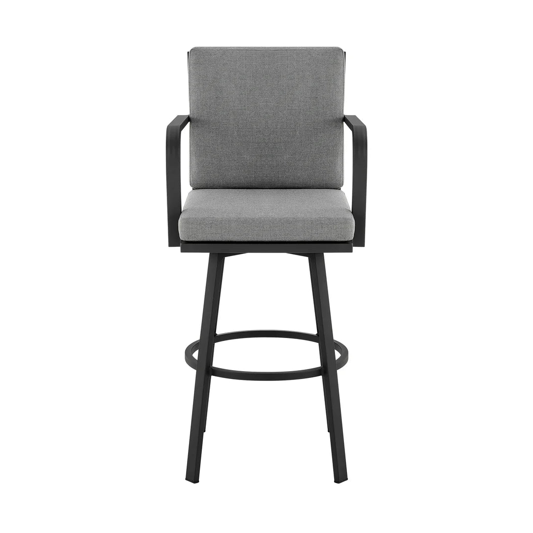 This armed barstool is crafted from weather resistant materials that allow it to be used indoor or outdoor. The strong aluminum frame is resistant to rust and its 360-degree swivel functionality allows for optimal mobility. The Arnauld features a sturdy 4 leg base and its ring footrest gives additional comfort for extended seating periods. The back and seat cushions are upholstered from polyester and have a convenient zipper closure that makes clean up a breeze! Polyester is strong, flexible and resists water damage and staining. It is tear-resistant and dries quickly.