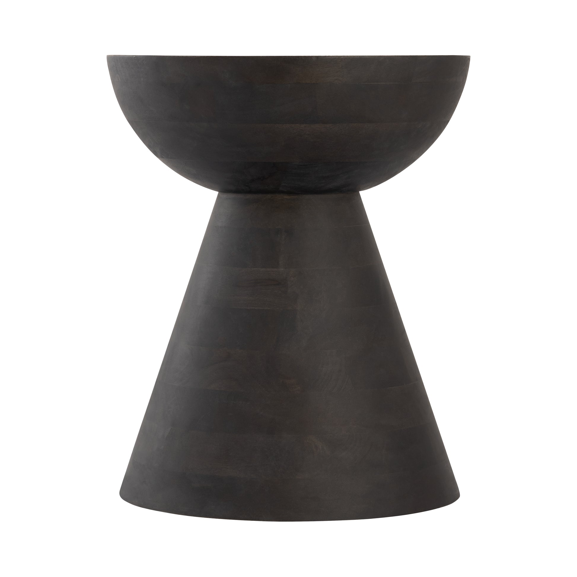 The Boyd Accent Table is a solid wood accent table with a textured wood finish. The table has an hourglass shape, tapering at the center and curving back up to create a solid round surface, adding to its versatile appeal.
