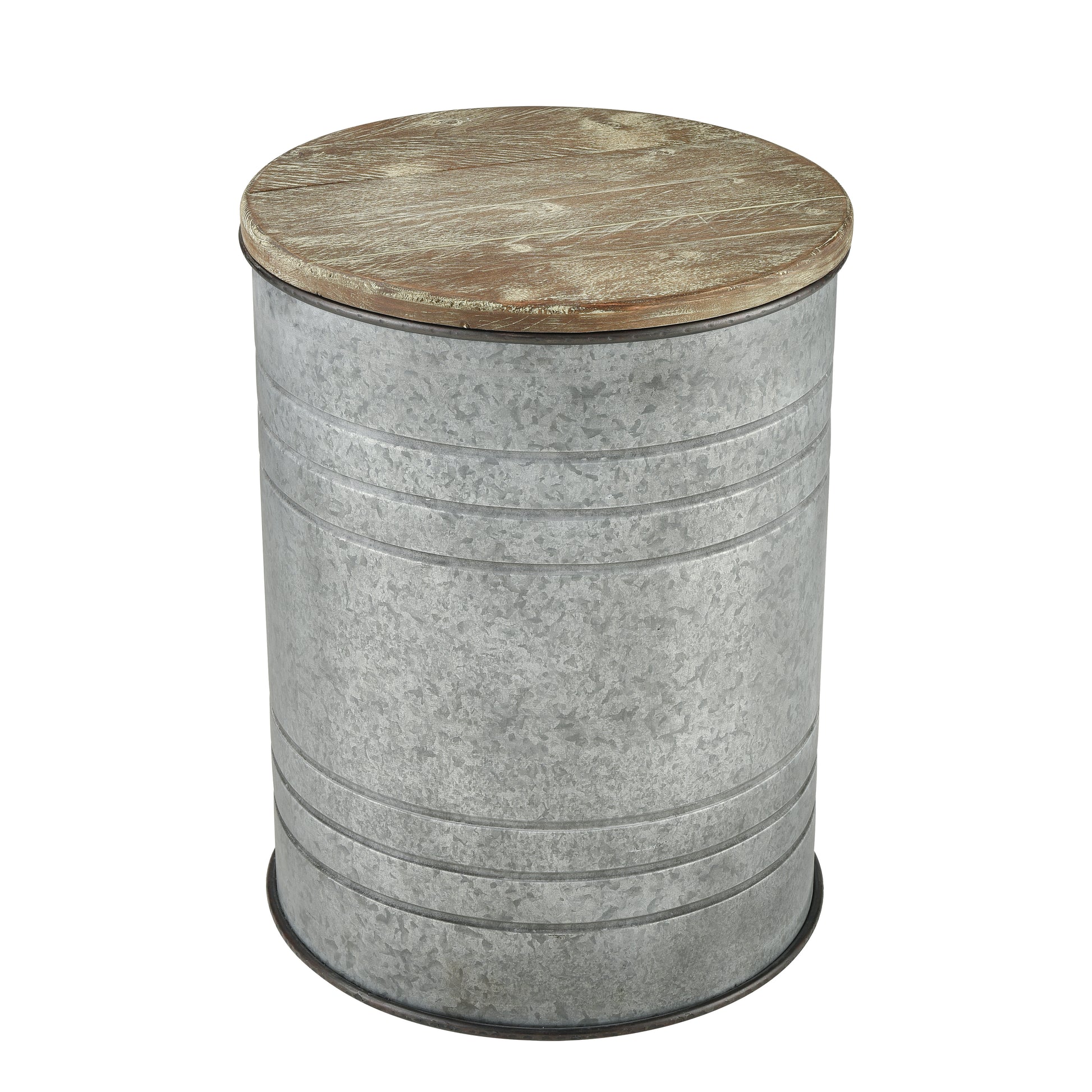 The Cannes Accent Table is a rustic drum shaped stool made from galvanized silver metal with a natural round wood top. The look is industrial and simple, ideal for patios and casual areas. The top lifts to reveal storage within.