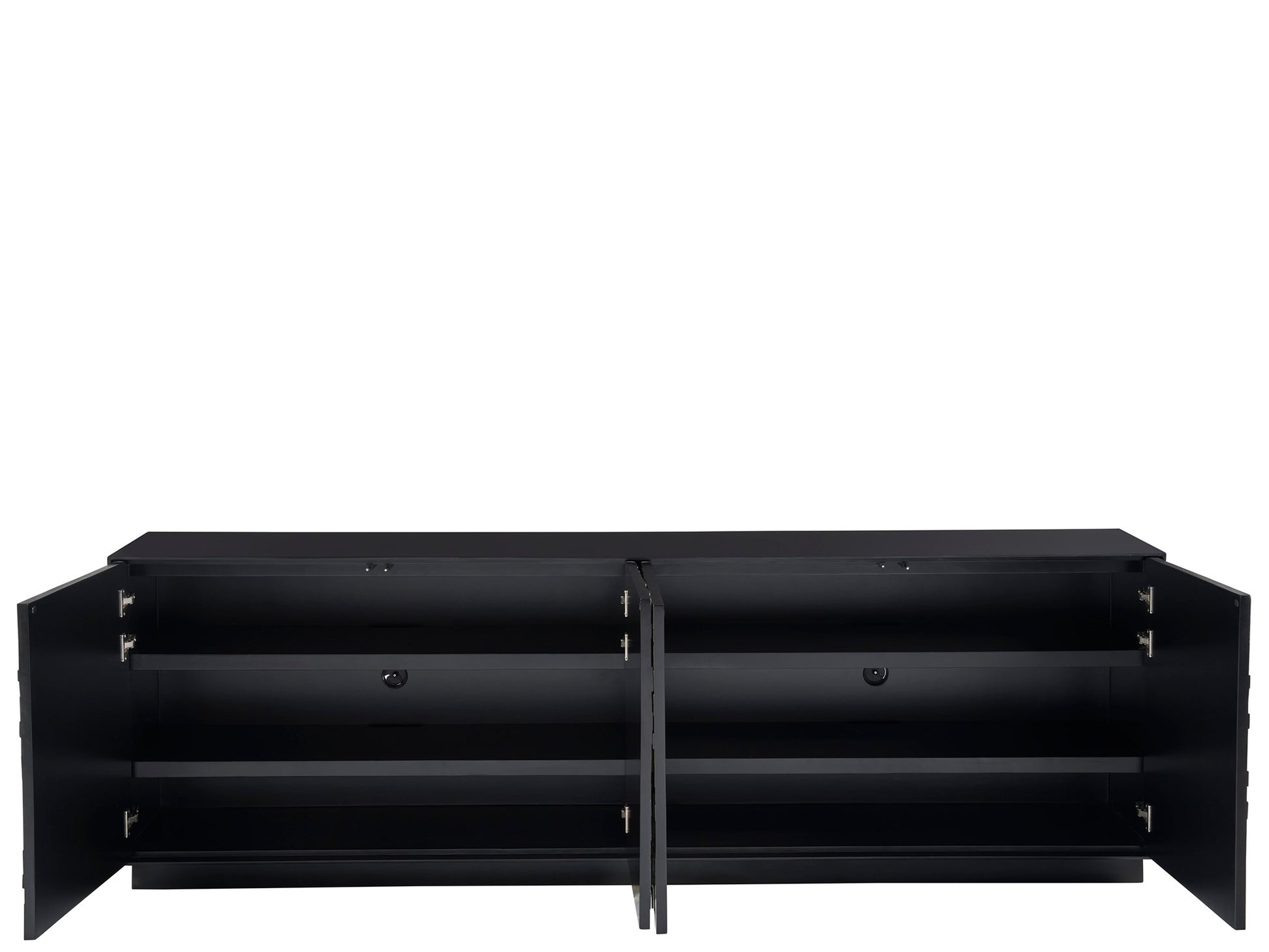 The Cosmo Credenza, crafted in Pyrite and finished in Matte Black, showcases a striking facade with its four doors, reminiscent of a sophisticated mosaic. This piece exudes confidence through its bold hues and defined silhouette, making it a statement of artistry and elegance in any space it adorns.