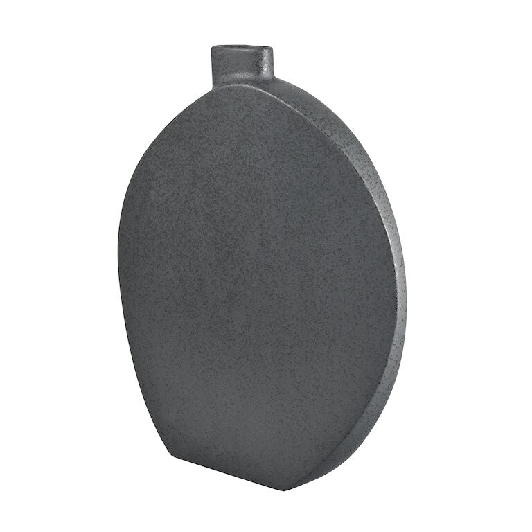 The circular body has a slim profile, and narrows to a small mouth opening. This vase is modern and chic.