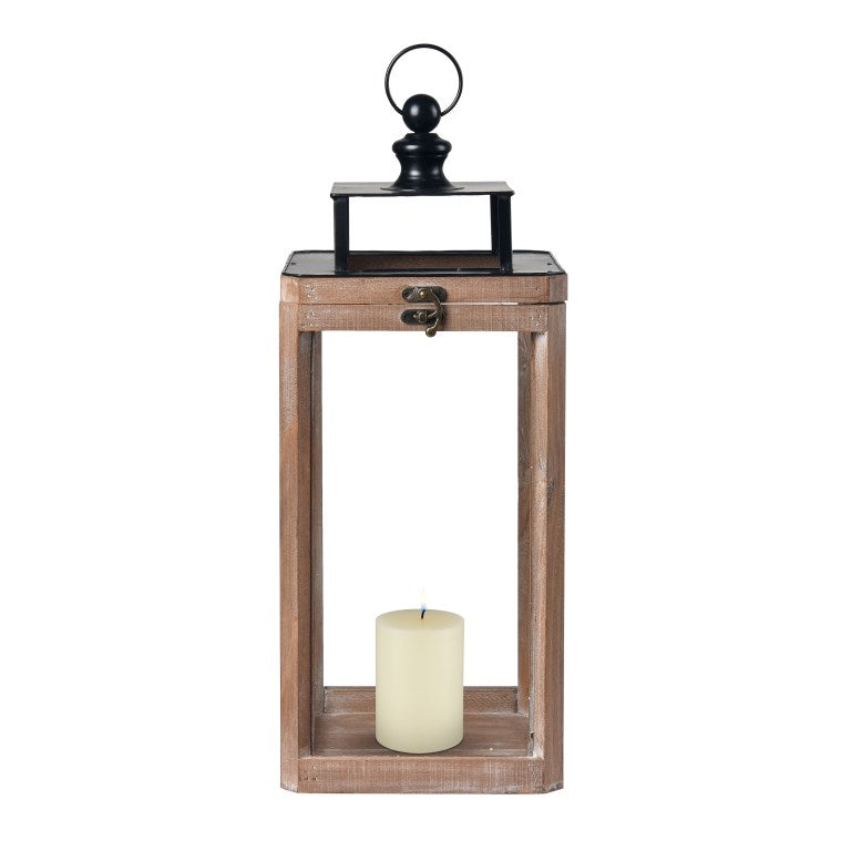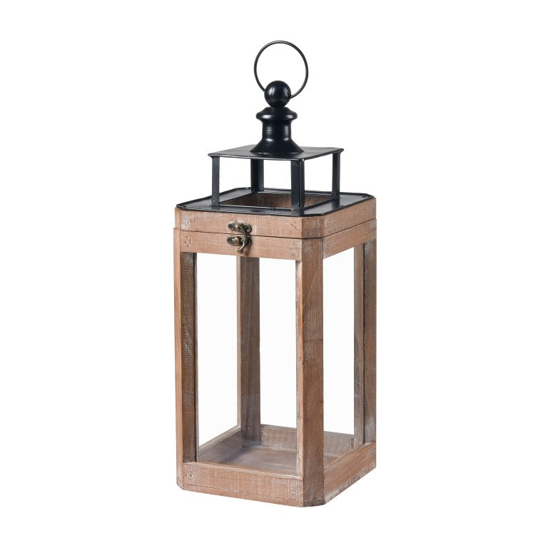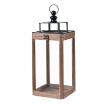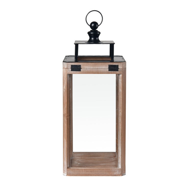 The Dowd Lanterns, sold as a set of two, are traditional brown wooden framed lanterns with clear glass paneled sides and metal fittings on top