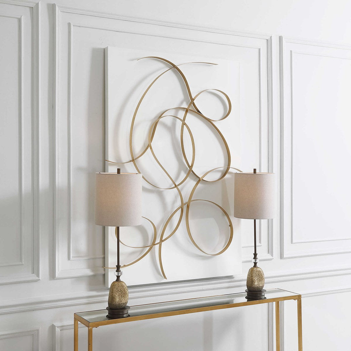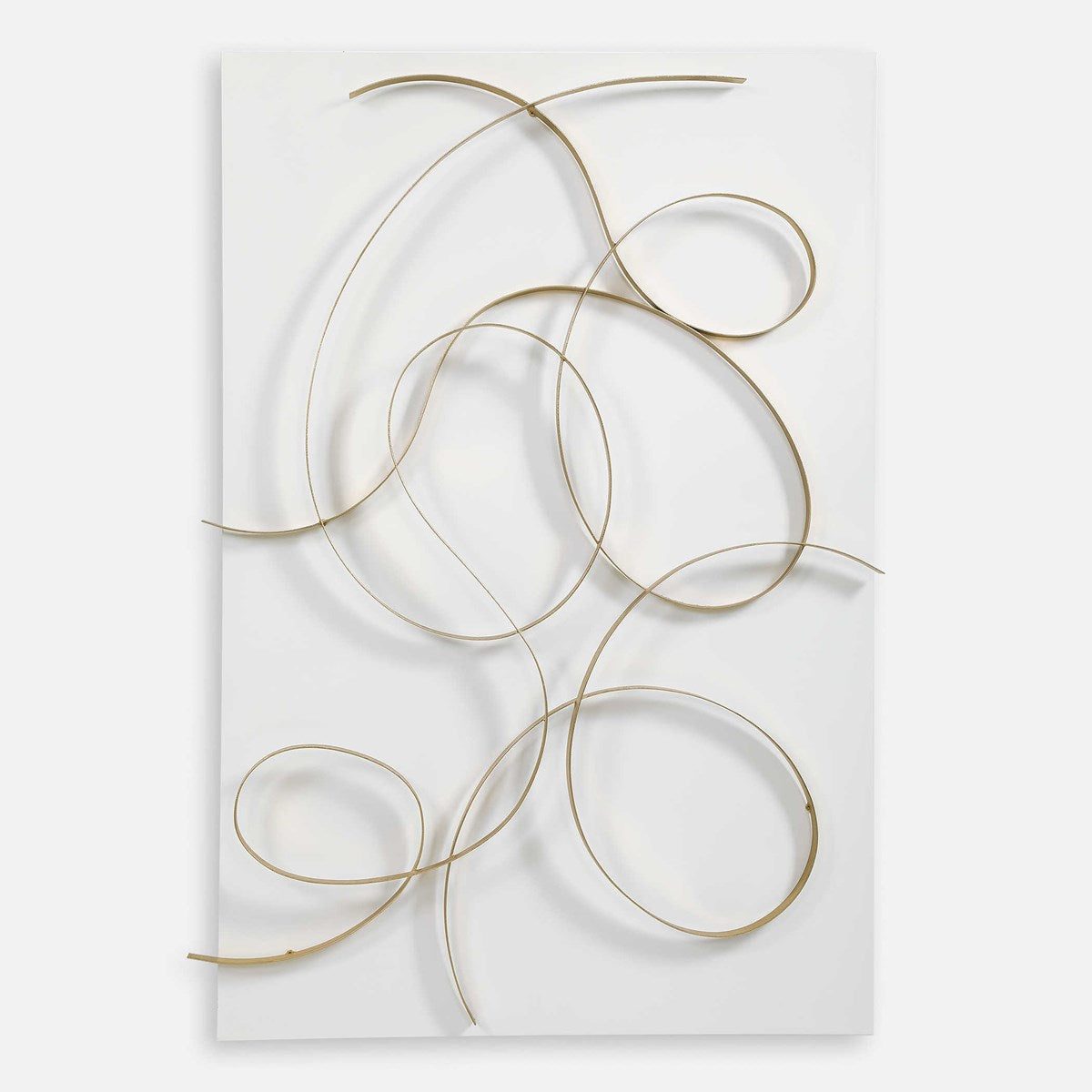 The matte white base is accented by a free-flowing hand forged metal design in a classic brushed gold finish. May be hung horizontal or vertical.